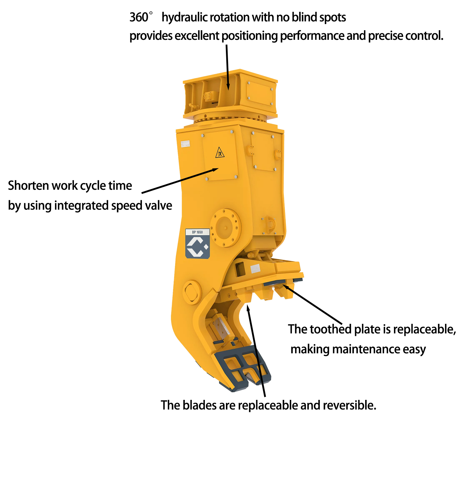 Most models can be optionally equipped with a hydraulic rotation mechanism, enabling 360-degree rotation of the attachment. This allows the operator to easily adjust the jaws to the optimal working angle while the excavator remains stationary, greatly enhancing operational flexibility and efficiency.