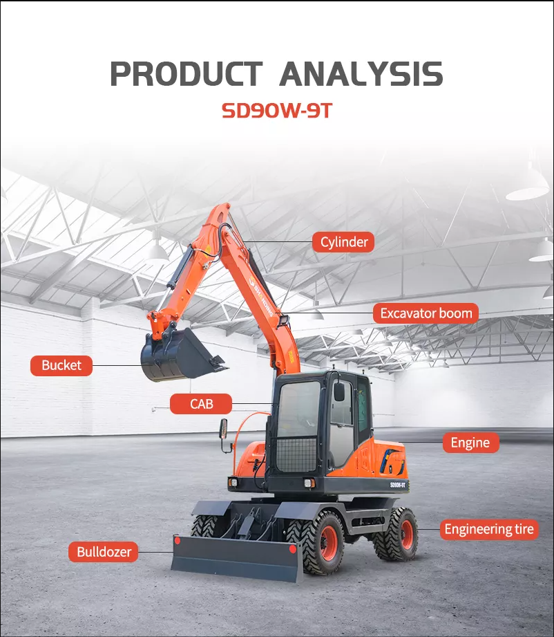 SD90W-9T is a 9-ton class wheeled excavator designed for diverse working conditions such as small-to-medium earthwork projects, municipal construction, farmland water conservation, and mining operations. It integrates an advanced hydraulic system, a powerful and reliable power train, and an ergonomic cab design, striking an excellent balance between operational efficiency, fuel economy, and operator comfort.